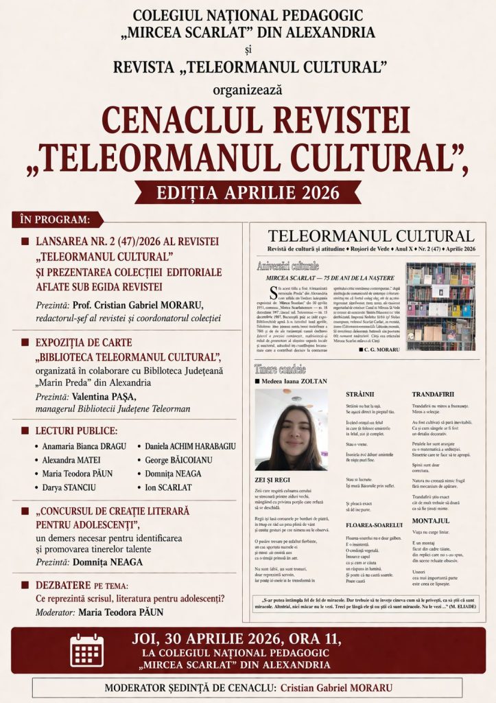 Biblioteca Județeană ,,Marin Preda” Teleorman, revista ”Teleormanul Cultural” și Colegiul Național Pedagogic „Mircea Scarlat” din Alexandria anunță organizarea unei noi ediții a Cenaclului revistei „Teleormanul Cultural”, eveniment dedicat promovării creației literare și dialogului cultural.