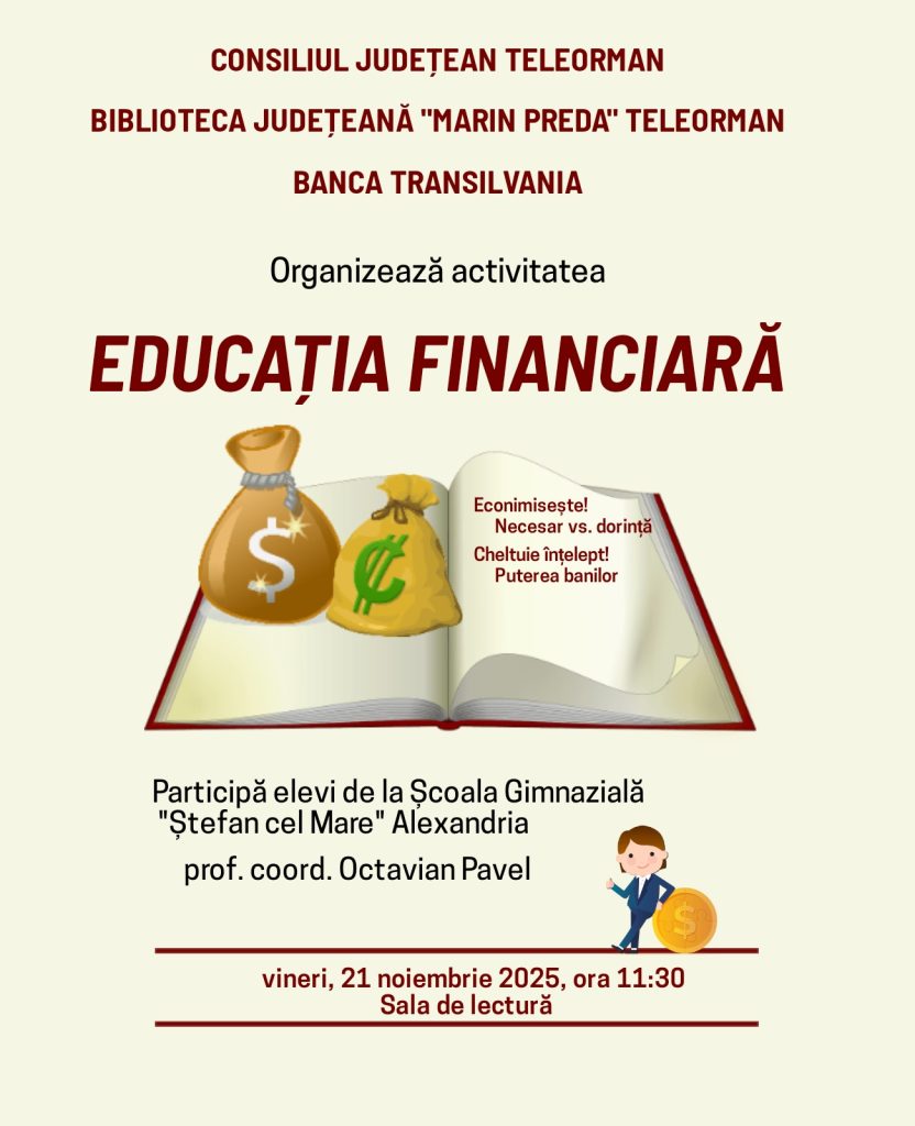 Biblioteca Județeană „Marin Preda” Teleorman organizează vineri, 21 noiembrie 2025, începând cu ora 11:30, la Sala de lectură, o sesiune de educație financiară dedicată copiilor.