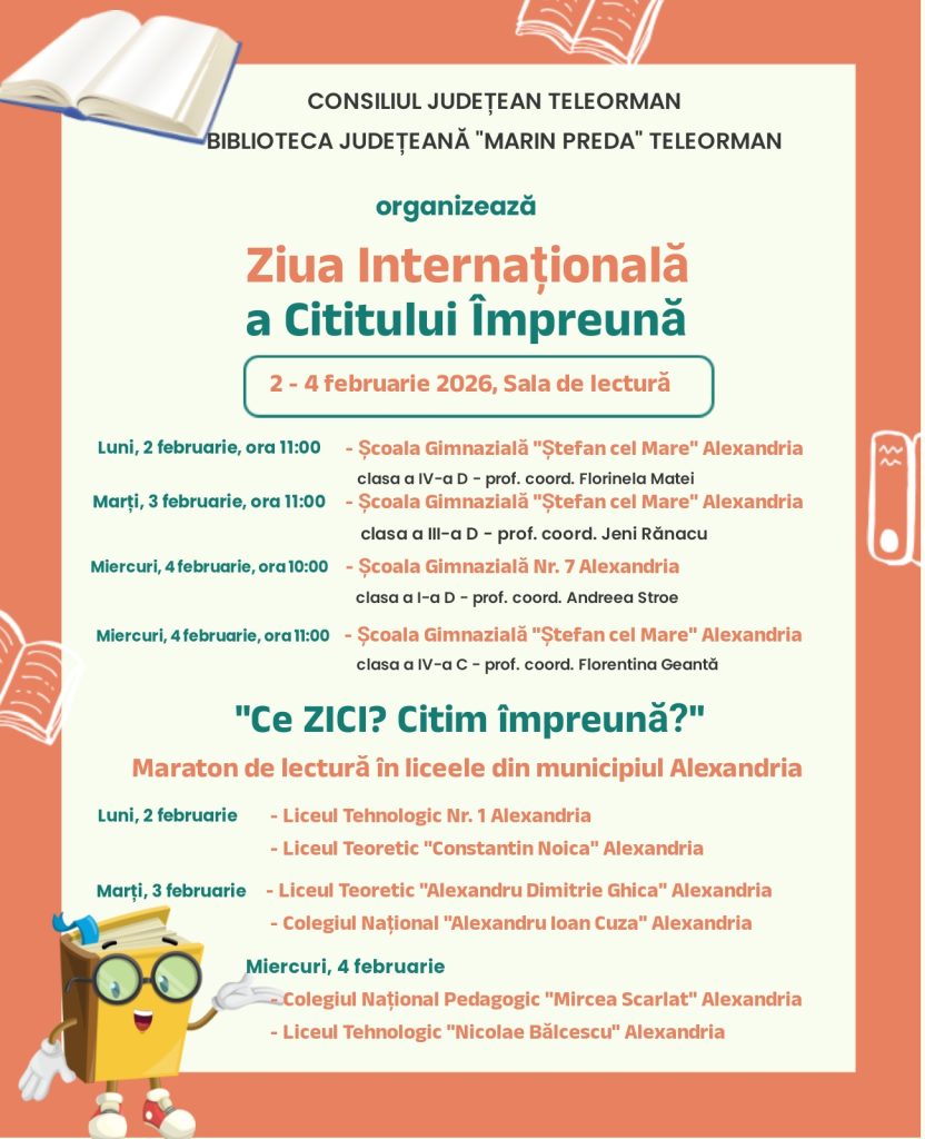 Consiliul Județean Teleorman, prin Biblioteca Județeană „Marin Preda” Teleorman, organizează, în perioada 2–4 februarie 2026, în Sala de lectură, manifestarea dedicată Zilei Internaționale a Cititului Împreună, un eveniment care promovează lectura ca activitate de conectare, dialog și formare culturală.