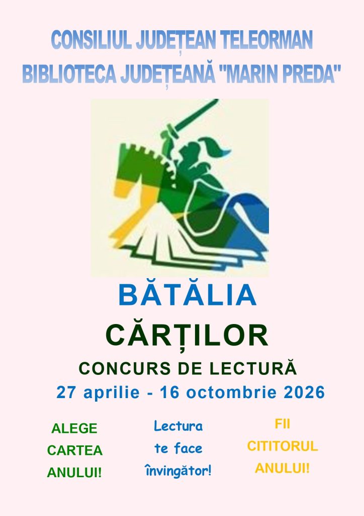 Biblioteca Județeană ”Marin Preda” Teleorman, instituție de cultură aflată în subordinea Consiliului Județean Teleorman, lansează marți, 21 aprilie 2026, ora 12.00, o nouă ediție a concursului de lectură ”Bătălia cărților”, un proiect dedicat elevilor pasionați de lectură și dezbatere.