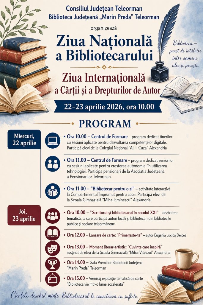 Cu această ocazie, Biblioteca Județeană „Marin Preda” Teleorman, va organiza în perioada 22- 23 aprilie 2026, Zilele Bibliotecarului în Teleorman în colaborare cu autori, cadre didactice, elevi și bibliotecari.